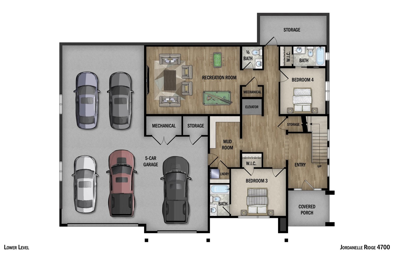 Downstairs, a spacious recreation room, guest suite, and bunk room offer flexibility for family and guests, complemented by a bar, kitchenette, and covered patio for effortless entertaining. The five-car garage provides unmatched storage for vehicles, gear, and toys, while thoughtful details throughout reflect Timber Ridge’s commitment to lasting quality.